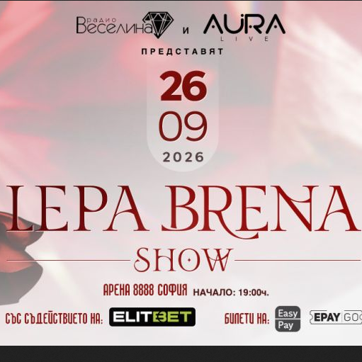 На 26 септември тази година от 19:00 часа легендата на Балканите Лепа Брена се завръща на българска сцена за грандиозен концерт. В най-голямата зала в страната – Арена София. Организатор на събитието е Aura Live. Официален медиен партньор – Радио Веселина.